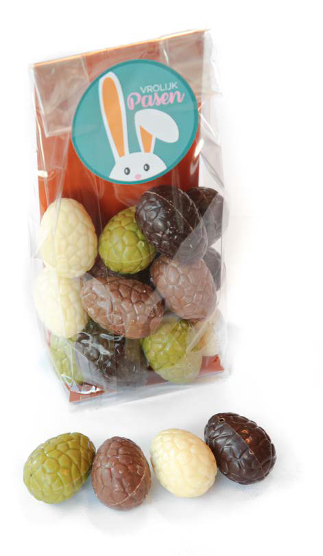 Zakje chocolade eitjes van premium chocolade van Callebaut. De massieve eitjes zijn een mix van melk, wit, puur en groen crispy chocolade.