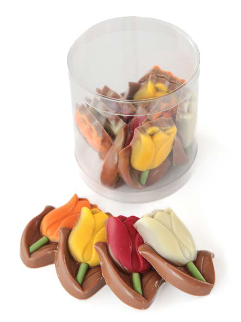 Overheerlijke en vrolijke chocolade tulpen in de kleuren geel, rood, oranje en wit. Elke koker bevat 12 chocolade tulpen (200 gram). Verkrijgbaar in melk en puur.